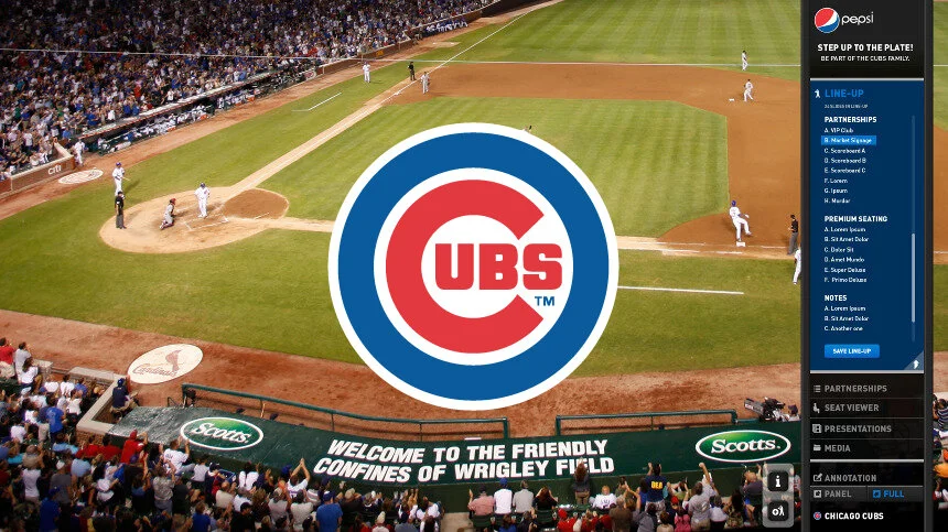 User interface and navigation functionality designed for the Chicago Cubs Corporate Sales Presentation Tool. Two 103" flat screen displays in the Chicago Cubs Preview Center hosted the interactive experience. Clients visiting the center learned about sponsorship opportunities at Wrigley Field.