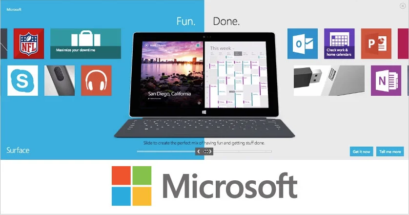 A rich media pushdown ad created for Microsoft to announce the Surface tablet. The interactive ad allows users to drag a slider navigation to reveal more "Fun" or "Done," representing the ability to multitask on the Surface.